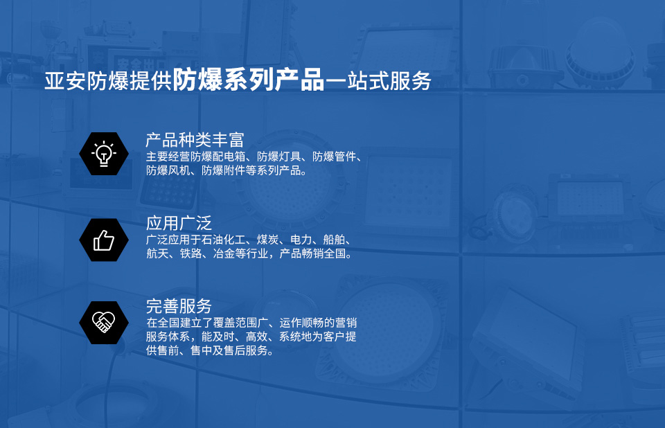 亞安是一家以防爆電器為主導(dǎo),集研發(fā)、制造、貿(mào)易、服務(wù)等功能于一體的民營企業(yè)